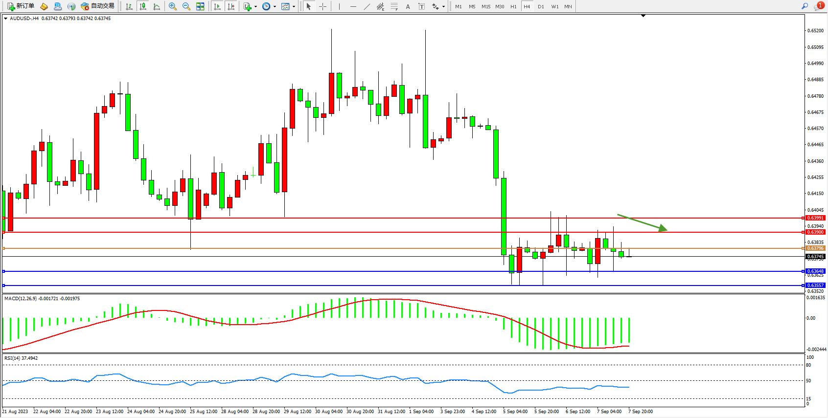 交易策略:0.63796下方看跌,目标0.63648 0.63557