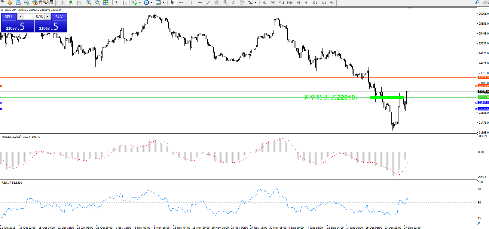 道琼斯指数DJ30—— 4小时K线图显示: