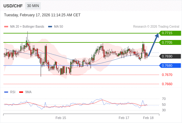 在 0.7680 之上,看涨,目标价位为 0.7705 ,然后为 0.7715 。