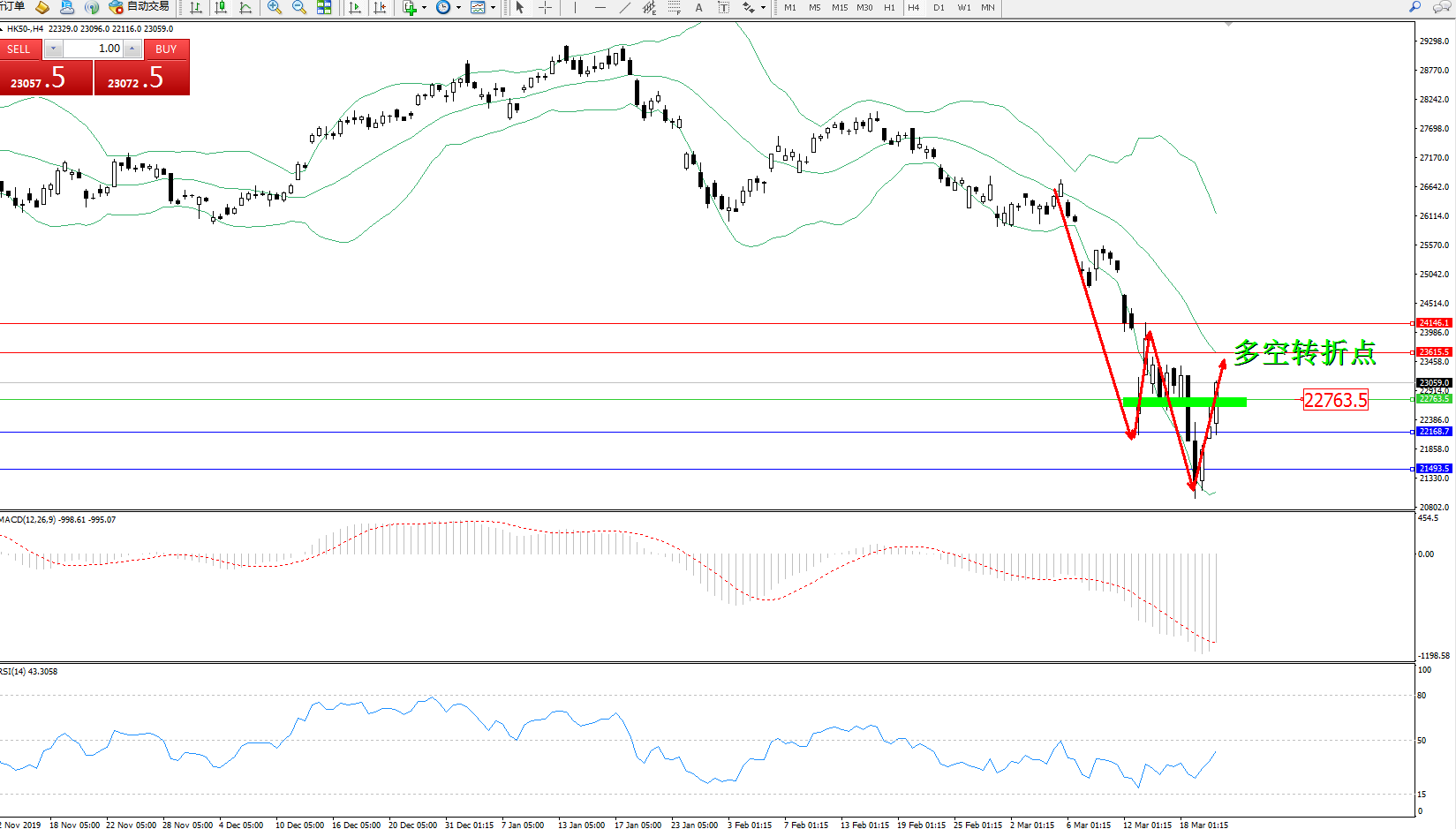 恒指HK50 ——4小时K线图显示: