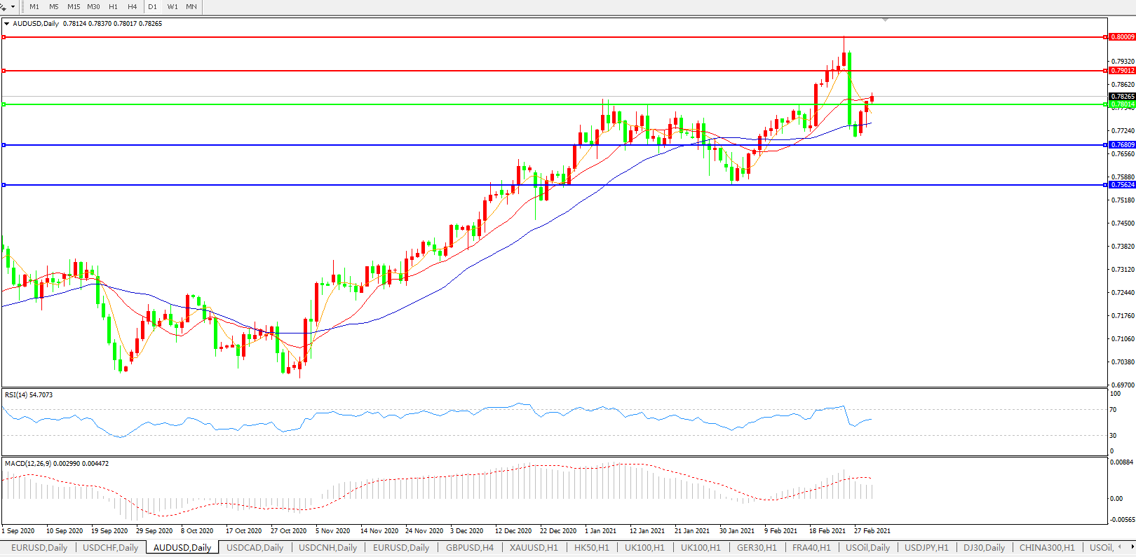 交易策略:0.7800上方看涨,目标0.7900、0.8000