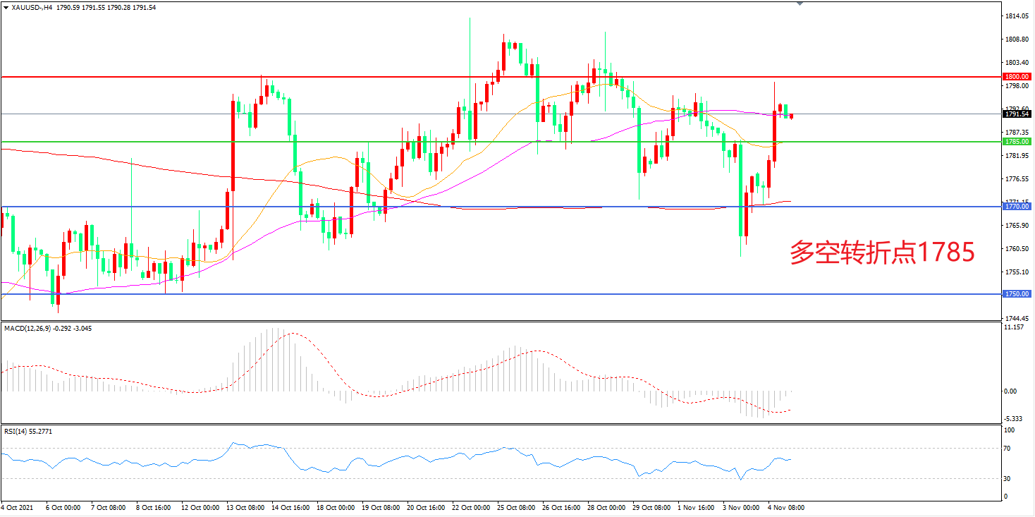 周四(11月3日),在美联储主席鲍威尔否认考虑加息释放鸽派信号后,英国央行也选择了按兵不动,10年期美债收益率盘中降约10个基点,现货黄金大幅拉升,收报1790.64美元/盎司。投资者开始意识到央行还在观望,货币政策快速收紧的风险有所减小,这样的预期转变利好金价,晚间市场将迎来最重磅的非农就业数据,如果非农数据表现不及预期,金价有望再度拉升。