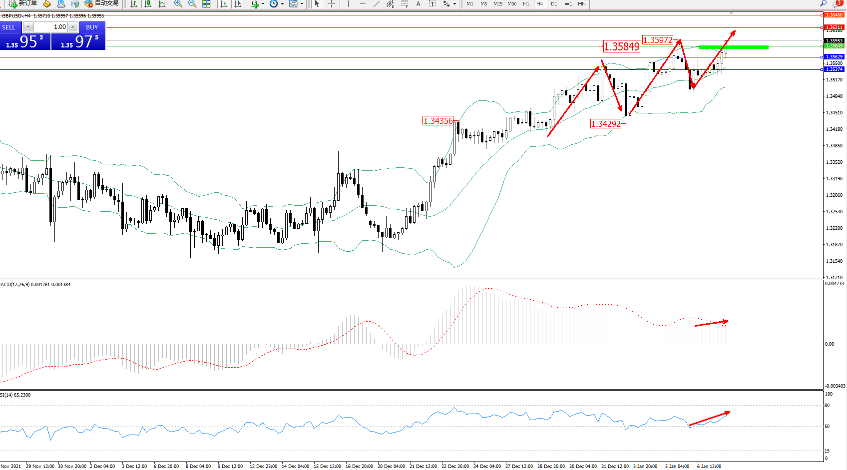 交易策略:1.35849上方看涨,目标1.36211、1.36460