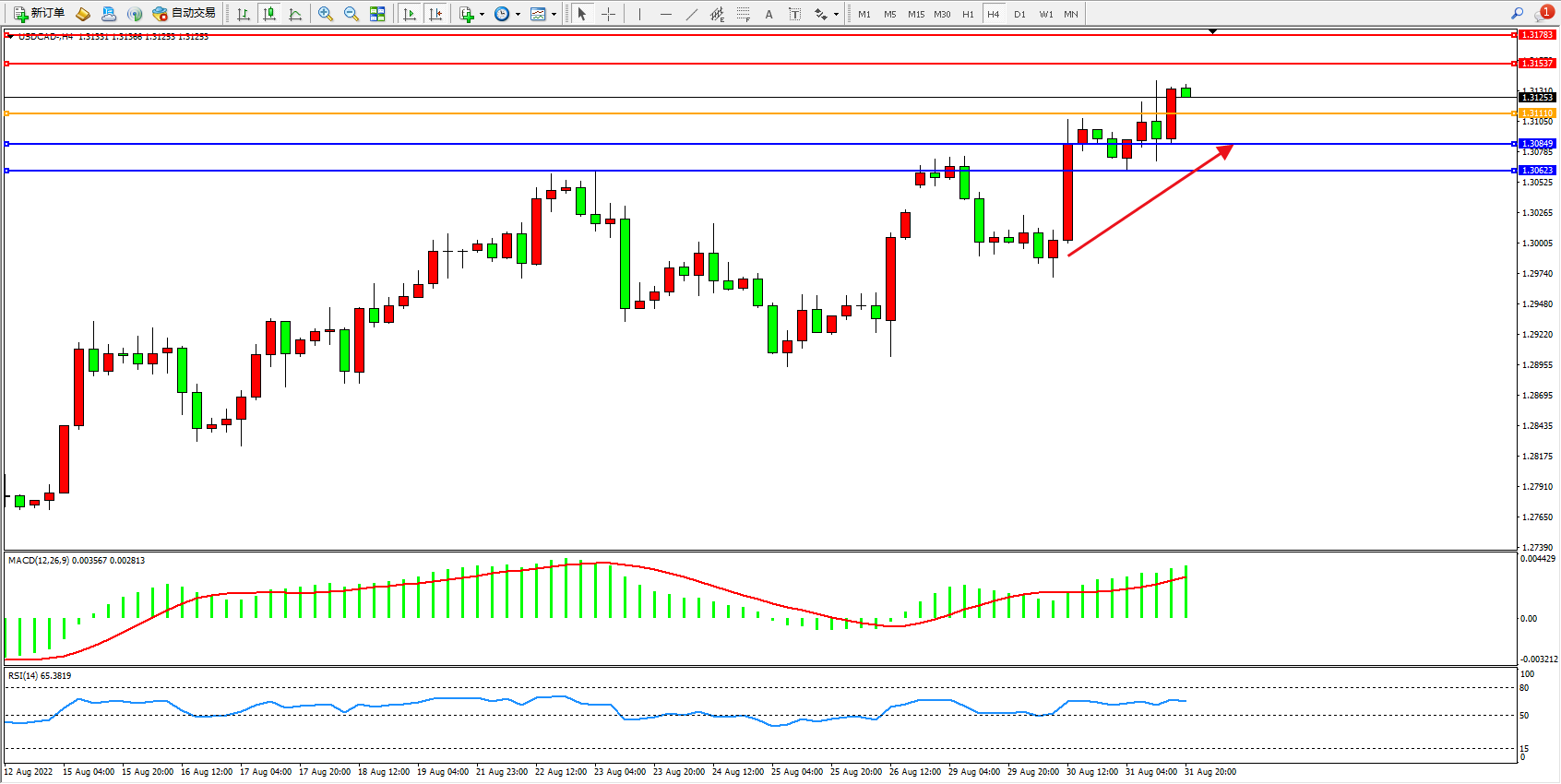 美元加元USDCAD——4小时K线图显示: