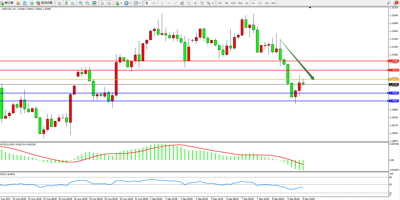 美元加元USDCAD——4小时K线图显示: