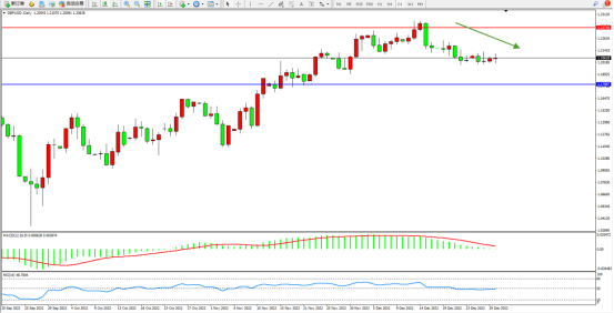 高位空头动力维持弱势整理缓慢下移,市场空头情绪开始涌现下行,上方压制关注1.23716附近,低位支撑关注1.17887附近,MACD指标处于0轴线附近弱势徘徊,RSI指标处于50均衡线附近弱势整理,如图: