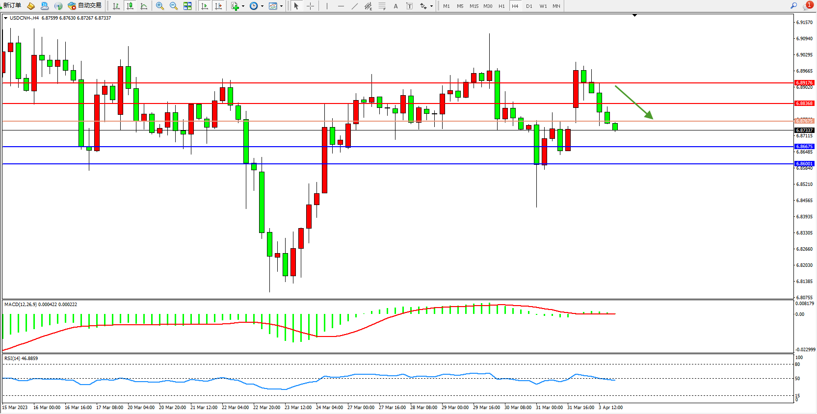 美元人民币USDCNH——4小时K线图显示:
