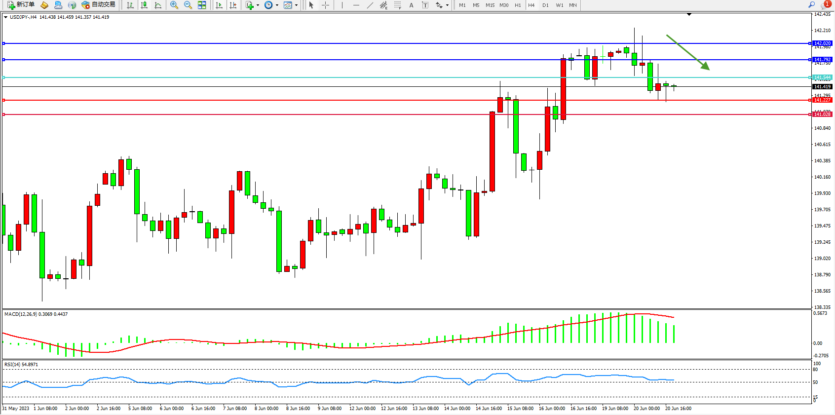 交易策略:141.544下方看跌,目标141.227  141.028