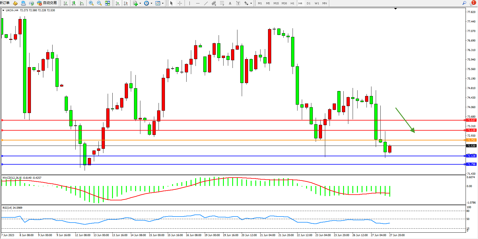 交易策略:72.753下方看跌,目标72.128  71.798