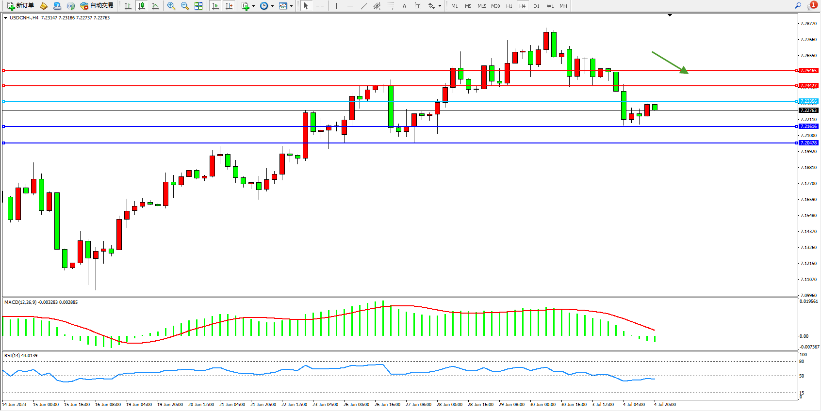 交易策略:7.23356下方看跌,目标7.21616 7.20478