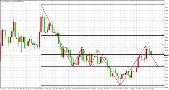黄金日线图,金价反弹前一波下跌(2080-1893)的斐波那契点位50%(1986)受压制回落,后市若进一步跌破1950关口,或迎来主跌浪。接下来重点关注1986阻力,该位之下趋势延续跌势,下方看1950-1935附近,同时1935作为短线较强支撑,该位若有效止跌则看反弹向上。