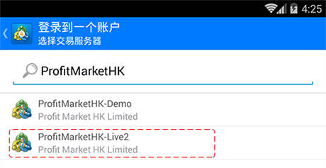 2.选择“登录一个已有账户”,搜索输入框内输入汇富宝的服务器“ProfitMarketHK-Live2”, 如图所示。