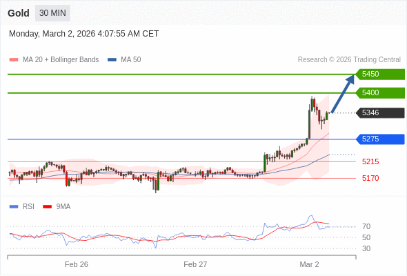 交易策略: 在 5275 之上,看涨,目标价位为 5400 ,然后为 5450 。
